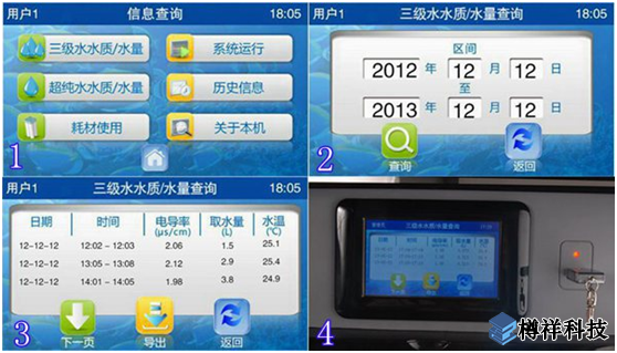 ◇ 在主畫面中點擊信息,出現信息查詢畫面(圖1)。這里提供對三級水水質/水量,超純水水質/水量,耗材使用,系統運行,歷史信息,關于本機等查詢功能的入口。