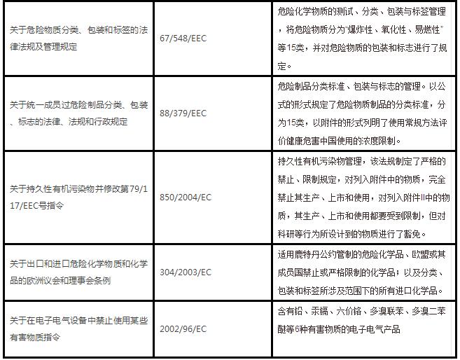 詳細規(guī)定了化學(xué)品的分類、標(biāo)簽要求、包裝及相關(guān)測試方法。但是,“舊”化學(xué)品管理體系存在很多不足,包括責(zé)任分配不合理;規(guī)定負責(zé)化學(xué)品危險評定的是政府而不是生產(chǎn)、進口和使用化學(xué)品的企業(yè);危險評定要求是全面的而非特定或?qū)R坏模鹊取?/p>