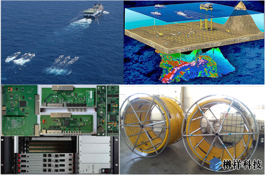 海洋物探船(左上)與物探原理圖(右上)、深水油氣勘探拖纜采集裝備核心儀器電路(左下)及固體電纜(右下)